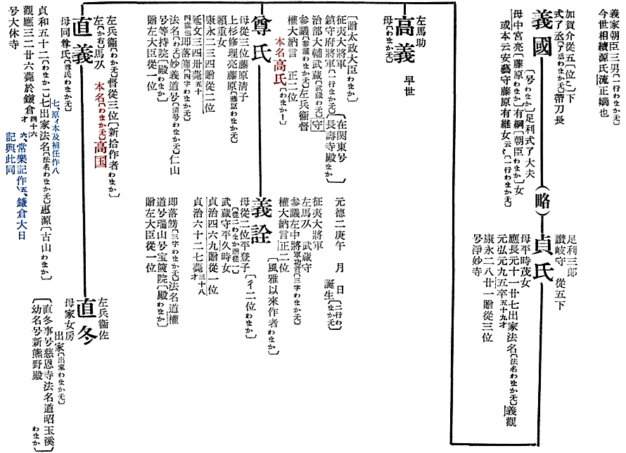 更に『甲斐国志』には、「生山系図」に拠って、武田信武(信宗の子)が尊氏の姪を妻にしたことが記載される*22。管見の限り「生山系図」の出典は不明だが、『甲斐信濃源氏綱要』には信武の子・武田氏信の加冠役を足利貞氏が務めたとの記載が見られる*23ので、強ちあり得ない話でもないだろう。この信武妻は尊氏の兄・高義、または弟・直義が父親であったとみるべきであろうが、直義に娘がいたという史実は系図類も含めて確認できない。直義ぐらい名の知れた人物であれば、直接 "直義の娘" と書けば良いとも思われるので、やはりこの女性もまた、高義の娘(遺児)とみなすのが妥当と思われる。
